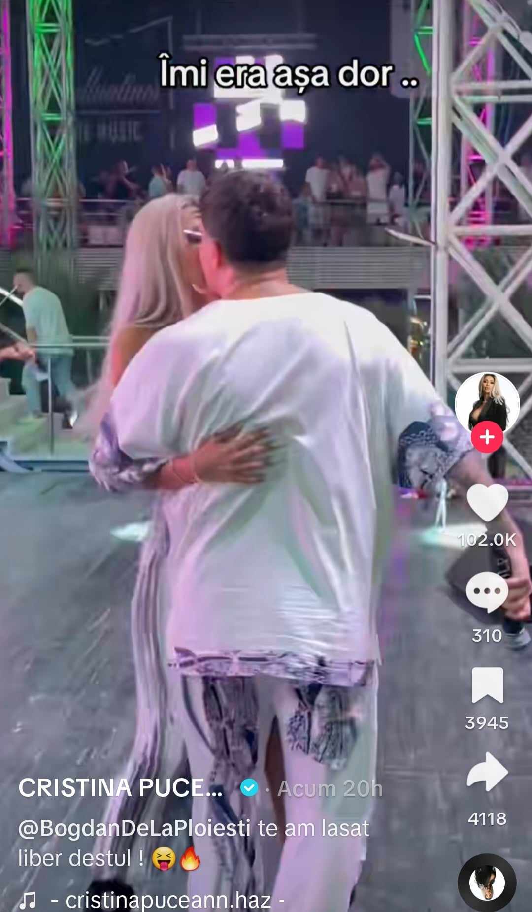 Pe conturile lor oficiale de Tik-Tok, cântărețul și iubita lui au postat un videoclip, din timpul unui concert, în care se sărutau, iar fanii au observat imediat că între ei dragoste plutește în aer. Mai mult decât atât, Cristina Pucean i-a transmis și un mesaj partenerul ei. Aceasta a spus că i-a fost dor și că l-a lăsat destul singur. Cei prezenți la concertul celebrului artist au aplaudat la momentul celor doi, iar reacțiile pozitive nu au încetat să apară.