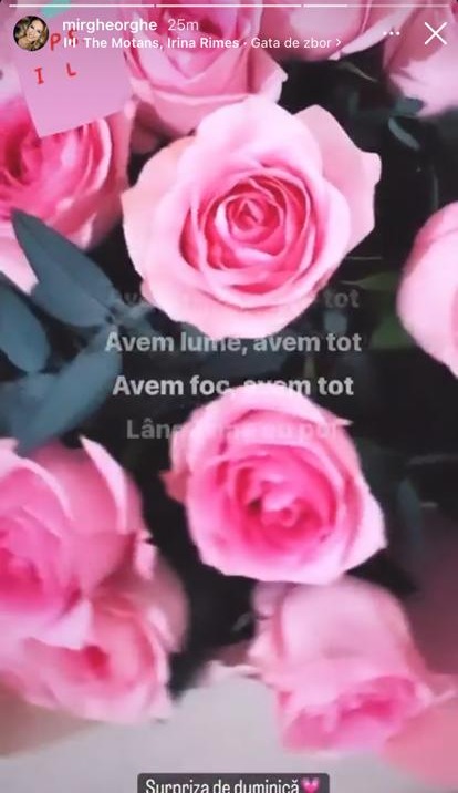 „Te iubesc. Surpriza de duminică”, a fost mesajul pe care Miruna l-a postat în mediul online, în dreptul scurtului filmuleț cu buchetul de flori primit.