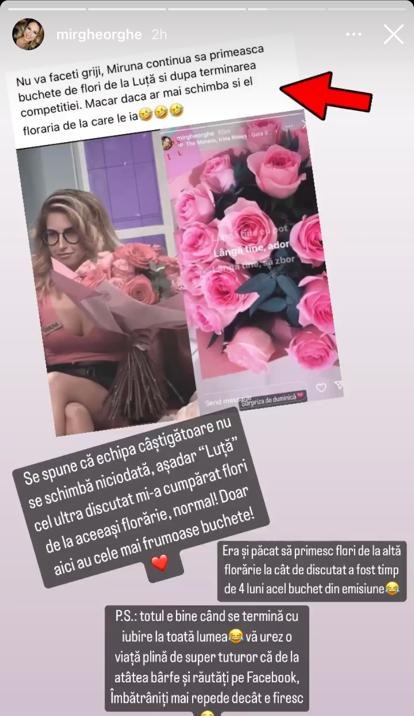 „Nu vă faceți griji, Miruna continuă să primească flori de la Luță și după terminarea competiției. Măcar dacă ar schimba și el florăria de la care le ia”, a fost postarea care a făcut-o pe Miruna să reacționeze în mediul online.