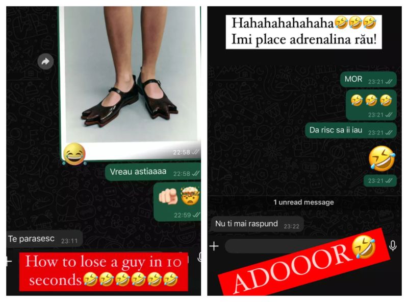 O convorbire de acest fel au avut și recent, atunci când artista i-a trimis pe WhatsApp o fotografie partenerului cu o pereche de încălțăminte hilară. Răspunsul afaceristului a venit imediat și într-o notă de umor i-a spus cântăreței că o va părăsi dacă achiziționează respectiva pereche de încălțări.