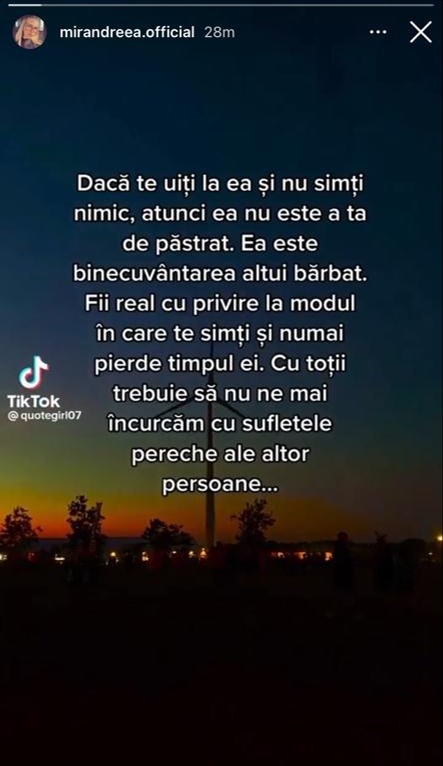 „Dacă te uiți la ea și nu simți nimic, atunci ea nu este a ta de păstrat. Ea este binecuvântarea altui bărbat. Fii real la modul în care te simți și nu mai pierde timpul ei. Cu toții trebuie să nu ne mai încurcăm cu sufletele pereche ale altor persoane...”, a fost mesajul pe care Miruna l-a postat în mediul online.