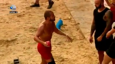 „Ce-ai, mă, de ai reacţiile astea?”, întreabă Jaguarul. Mirel se întoarce cu spatele şi aruncă un săculeţ de nisip înspre Ionuţ.