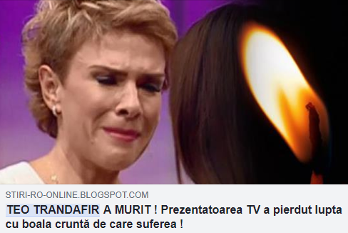 Totul a pornit dupa ce un site oarecare a anuntat cu durere si regret decesul prezentatoarei de televiziune Teo Trandafir. Din fericire, vedeta de la Kanal D se simtea foarte bine, nu se afla in pericol, iar starea sa de sanatate era excelenta, stirea neasteptata fiind fabricata pentru a se creste traficul site-ului care o inventase si o publica. (Nunta la Teo Show. A spus "Da!")
