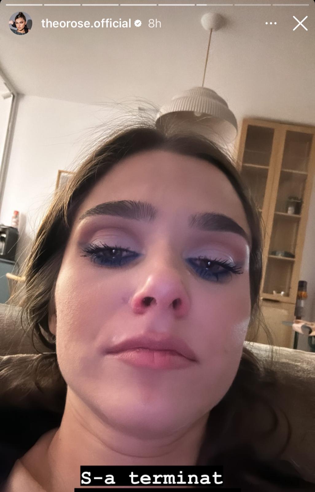 „S-a terminat”, a scris Theo Rose, în dreptul unei imagini în care apare cu lacrimi în ochi.