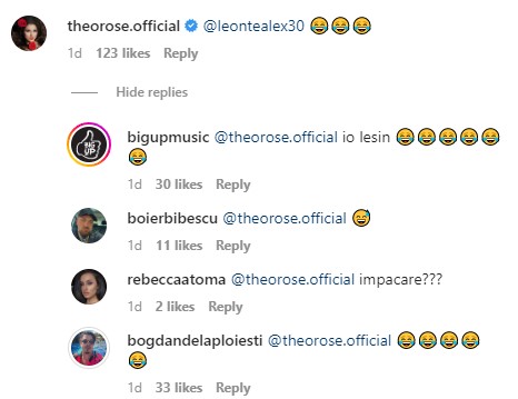 Astfel că, s-a înscris și ea la concurs, etichetându-l în secțiunea de comentarii chiar pe fostul ei iubit, Alex Leonte. Reacțiile fanilor nu au întârziat să apară, crezând că e vorba despre o împăcare, dar surprinzător a fost comentariul lui Bogdan de la Ploiești, care s-a arătat amuzat de întreaga situație. Parcă nici lui nu îi venea să creadă ce a făcut colega lui de scenă. Astfel, probabil cântăreața a vrut să facă o glumă și să vadă ce reacții vor fi din partea celor care o urmăresc.