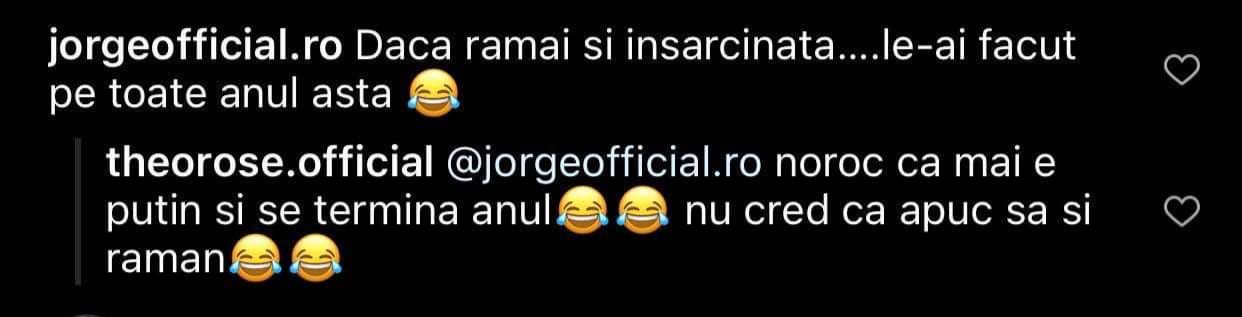 Jorge i-a spus artistei că dacă mai rămâne și însărcinată anul acesta, cu siguranță le-a făcut pe toate. Mai în glumă, mai în serios, Theo Rose i-a dat imediat o replică amuzantă.
