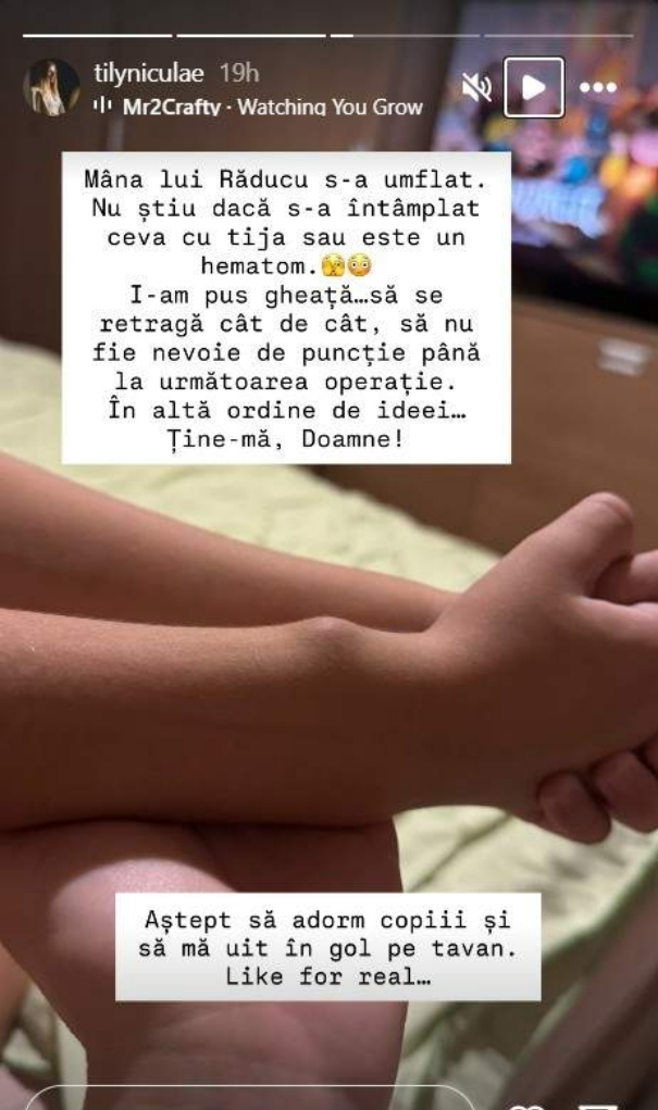 „Mâna lui Răducu s-a umflat. Nu știu dacă s-a întâmplat ceva cu tija sau este un hematom. I-am pus gheață… să se retragă cât de cât, să nu fie nevoie de puncție până la următoarea operație. În altă ordine de idei, ține-mă Doamne”, a scris Tily Niculae, pe Instagram.