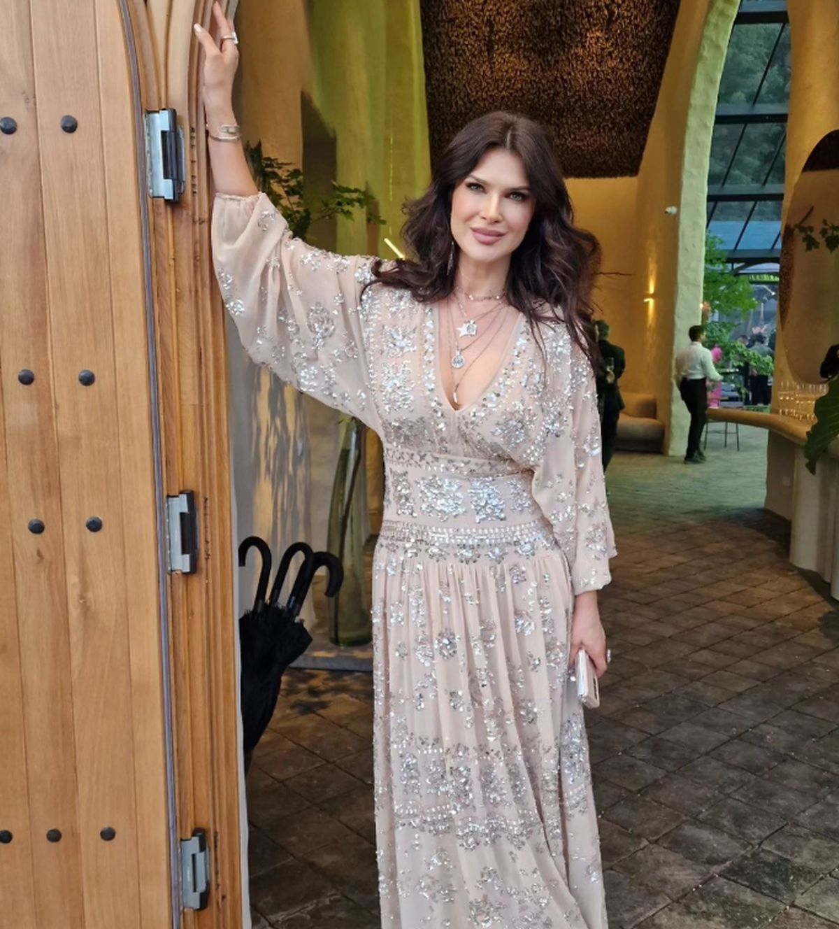 Actrița și-a lăsat părul desfăcut, în bucle lejere și a făcut ca look-ul să fie unul ideal pentru o petrecere în afara orașului. La gât, vedeta TV și-a pus o serie de accesorii și a scos în evidență decolteul de invidiat!