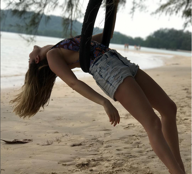 In prima zi ea a imbracat costumul de baie sau jeansi scurti si s-a pozat in apa oceanului sau jucandu-se pe plaja si bucurandu-se de zilele libere de vacanta. Indrazneala sa a continuat, iar in ziua aniversarii sale ea s-a fotografiat in ipostaze sexy, in bratele sotului ei care apare si el la bustul gol, sau ea avand sanii liberi si neprotejati de un sutien.