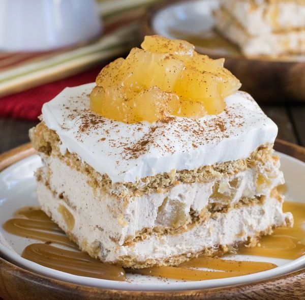 Tort de biscuiti pregatit cu un strat de mere, un strat de crema de vanilie si acoperit cu multa frisca.