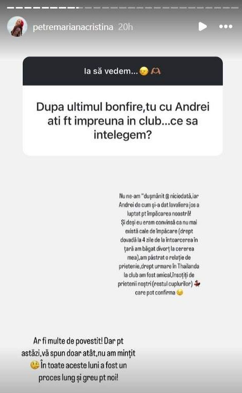 „Nu ne-am dușmănit niciodată, iar Andrei de cum și-a dat lavaliera jos a luptat pentru împăcarea noastră! Și deși eu eram convinsă că nu mai există cale de împăcare (drept dovadă la patru zile de la întoarcerea în țară am băgat divorț la cererea mea), am păstrat o relație de prietenie, drept urmare în Thailanda, în club, am fost amical, însoțiți de prietenii noștri (restul cuplurilor) care pot confirma. Ar fi multe de povestit! Dar pentru astăzi vă spun doar atât. Nu am mințit. În toate aceste luni a fost un proces lung și greu pentru noi”, a scris Cristina la Story.