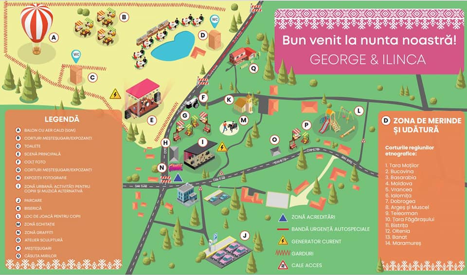 La petrecerea din acest weekend, cei care își doresc să meargă vor găsit: balon cu aer cald; corturi meșteșugărești; scene unde vor concerta artiști români, dar și o scenă principală; expoziții de fotografie; activități pentru copii; loc de joacă pentru copii; zonă de echitații și de graffiti; ateliere de sculptură; căsuța mirilor. Tot aici a fost amenajată și o biserică, iar parcările se află la intrare în eveniment.