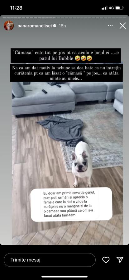 Mai exact, cel mai „cald” subiect pe baza căruia oamenii au criticat-o pe Oana Roman a fost cel legat de curățenie. Una dintre urmăritoarele sale i-a atras atenția în mediul online că nu întreține curățenia în casă și că pe jos stătea aruncată o cămașă. Fiica lui Petre Roman a intervenit imediat, lămurind-o pe respectiva persoană că acea presupusă cămașă nu este decât păturica unuia dintre cățelușilor săi, și nicidecum o cămașă de-a sa pe care a aruncat-o pe jos.