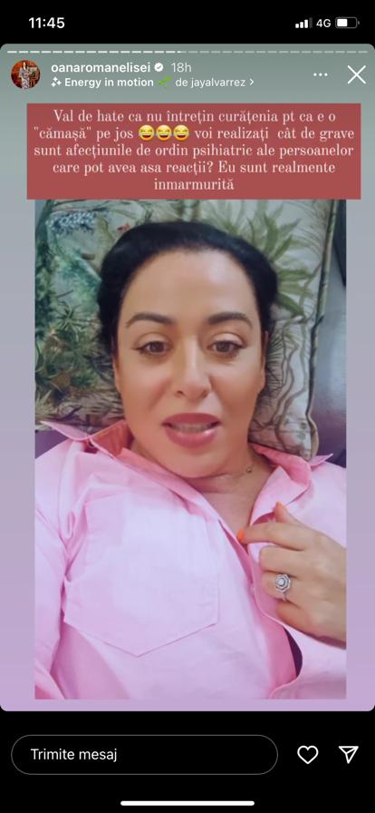 Nu peste mult timp, Oana Roman a revenit cu un mesaj în mediul online în care a scris că această atitudine se naște numai din frustrare, pe care unii aleg să o gestioneze aruncând în ceilalți cu noroi. Vedeta a ținut să precizeze că, în ciuda faptului că și ea trece prin astfel de stări, mai ales acum, alege să încerce să le gestioneze așa cum știe mai bine și să-și vadă în continuare de viața sa, fără să se uite în ograda altuia și să critice în mod gratuit.