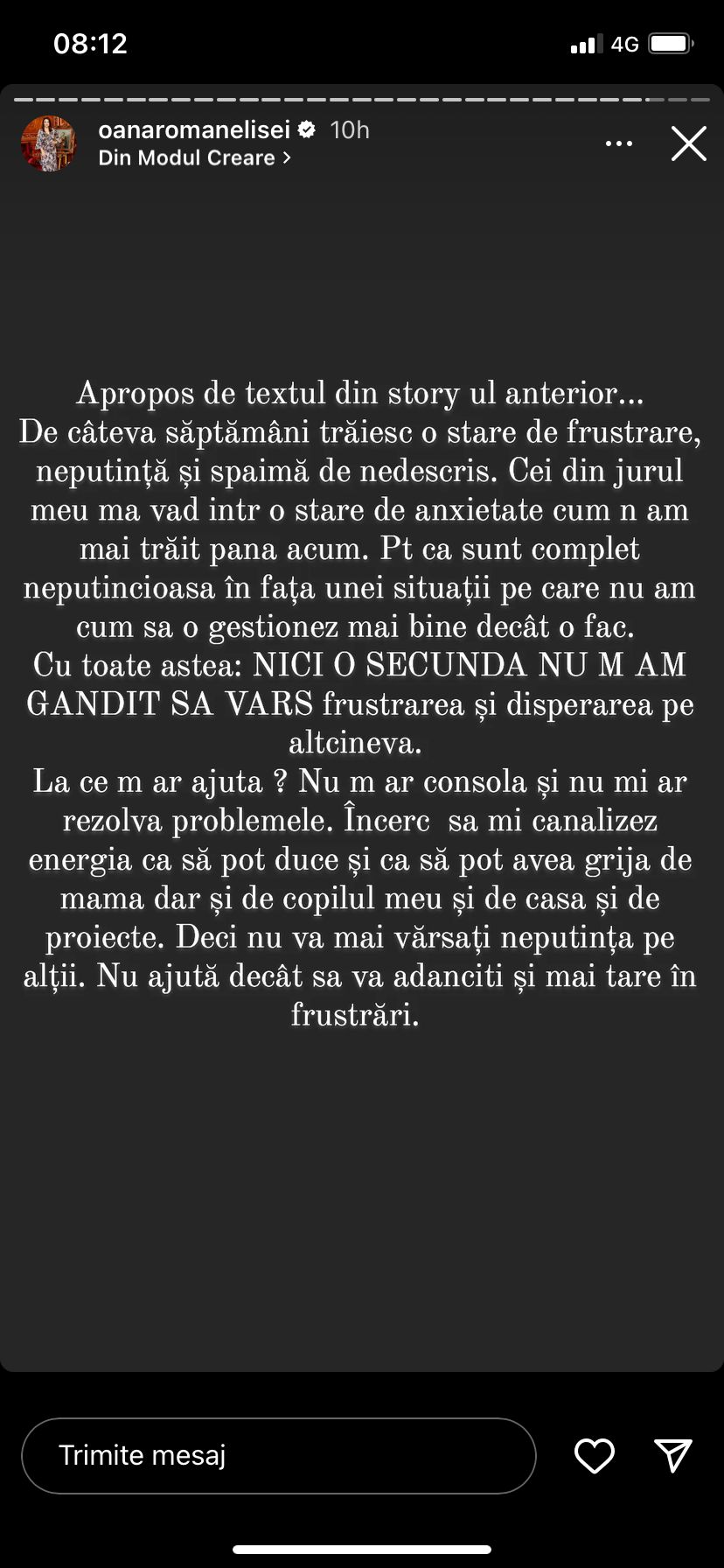 „Apropo de textul din story-ul anterior… De câteva săptămâni trăiesc o stare de frustrare, neputință și spaimă de nedescris. Cei din jurul meu mă văd într-o stare de anxietate cum n-am mai trăit până acum. Pentru că sunt complet neputincioasă în fața unei situații pe care nu am cum să o gestionez mai bine decât o fac. Cu toate acestea: nicio scundă nu m-am gândit să vărs frustrarea și disperarea pe altcineva. La ce m-ar ajuta? Nu m-ar consola și nu mi-ar rezolva problemele. Încerc să-mi canalizez energia ca să pot duce și ca să pot avea grijă de mama și de copilul meu, și de casă, și de proiecte. Deci nu vă mai vărsați neputința pe alții. Nu ajută decât să vă adânciți și mai tare în frustrări.”, a scris Oana Roman pe Instagram.