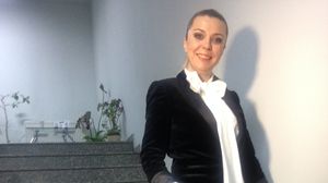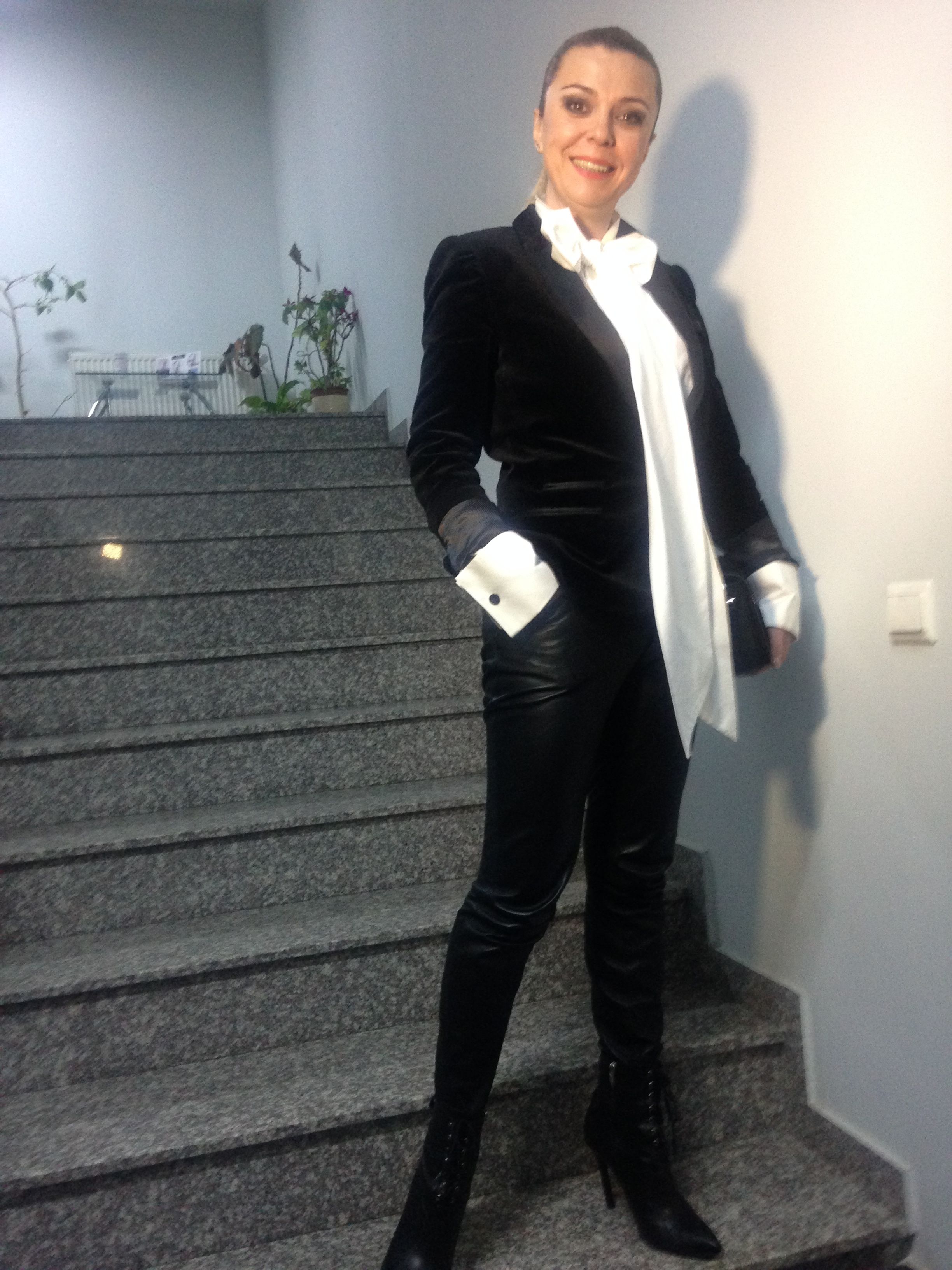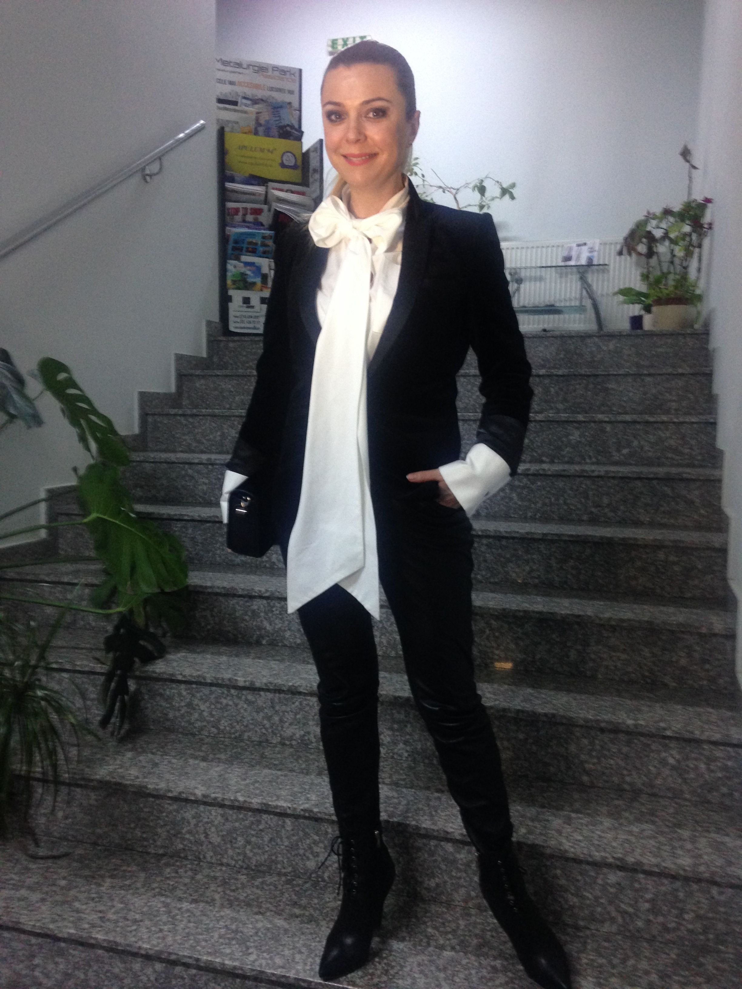 Crina Matei a ales sa poarte o pereche de pantaloni de piele negri, stramti, care ii arata picioarele subtiri, mult schimbate fata de perioada de vara, un sacou din catifea neagra, cambrat, ghete negre, plic in acelasi ton, si o camasa alba, cu o funda de dimensiuni mari si butoni negri la mansete, care dadea o nota diferita vestimentatiei.