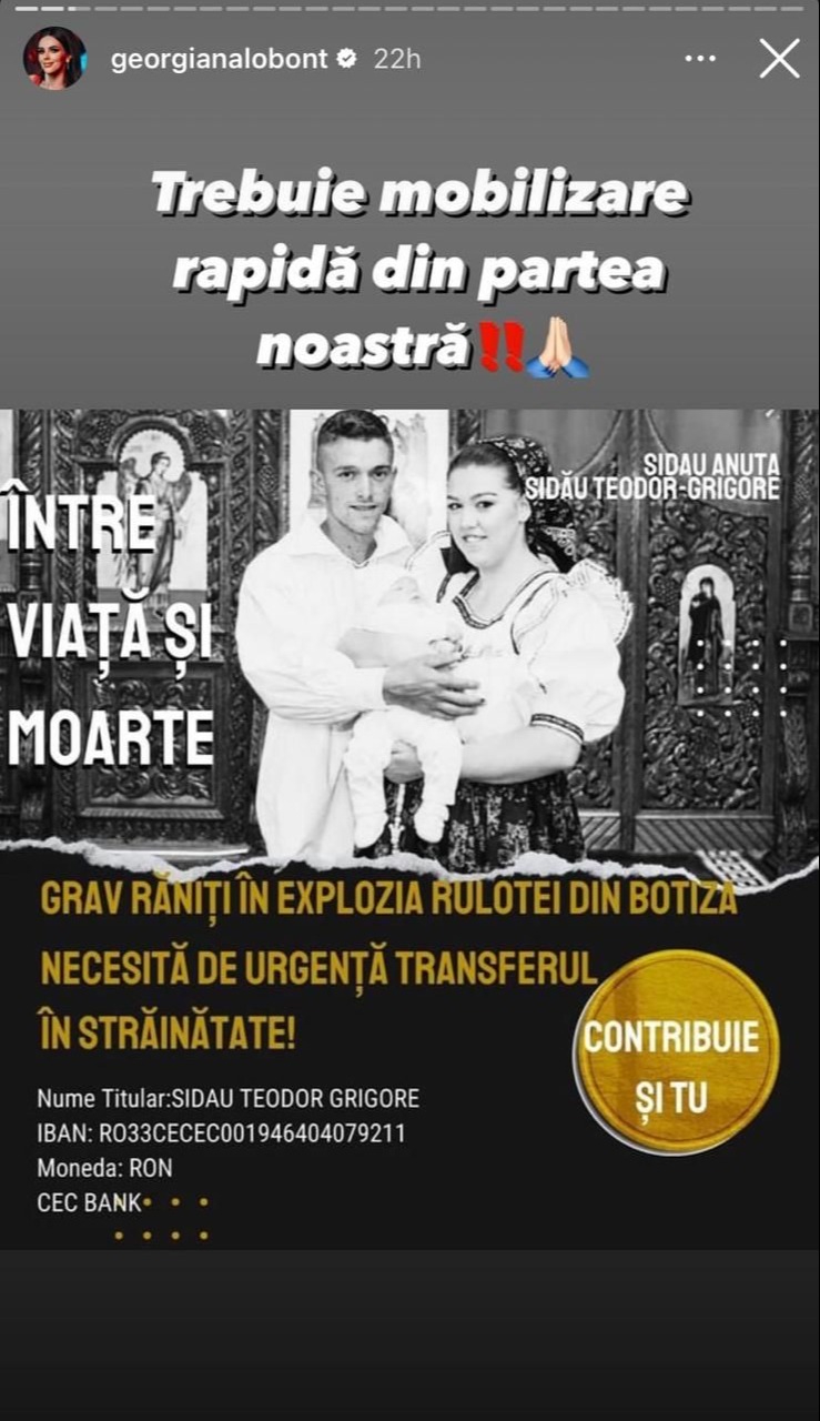 Recent, Georgiana Lobonț și-a îndemnat fanii să sprijine cazul a doi tineri care cu grave probleme de sănătate, care necesită să fie transferați în străinătate, după ce au avut ghinionul să fie victimele exploziei rulotei din Botiza, Maramureș. Amintim că, în urmă cu doar două zile, a avut loc o tragedie în satul maramureșean Botiza, când un fast-food, stabilit într-o rulotă, a explodat. În urma incidentului, 5 persoane au ajuns cu arsuri la spital, printre care s-a numărat și un copil în vârstă de doar 3 ani care, din nefericire, se afla lângă rulotă în acel moment.