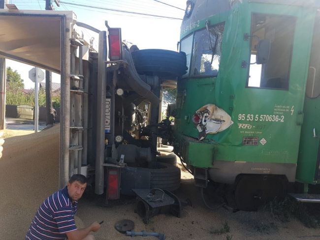 Potrivit primelor informații, trenul a lovit un camion care era încărcat cu nisip. În urma impactului camionul s-a răsturnat, fiind lovit în partea din spate, la remorcă.