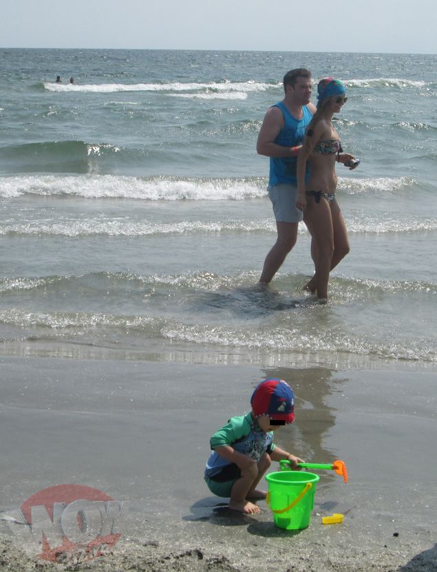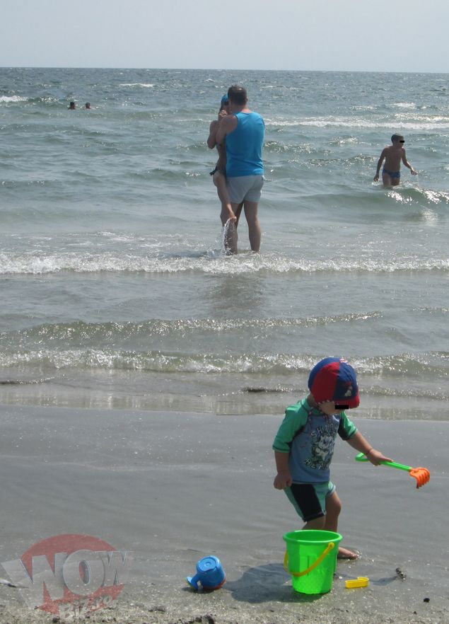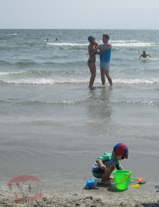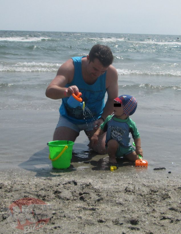 Cei doi parinti s-au jucat cu copilul la malul marii