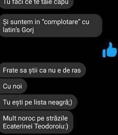 Tânărul îl amenință pe cel care a postat imaginile, spunându-i că el și „gang-ul” lui (n.r.- gașca) l-au trecut pe lista neagră, și că de acum ar trebui să evite anumite zone.