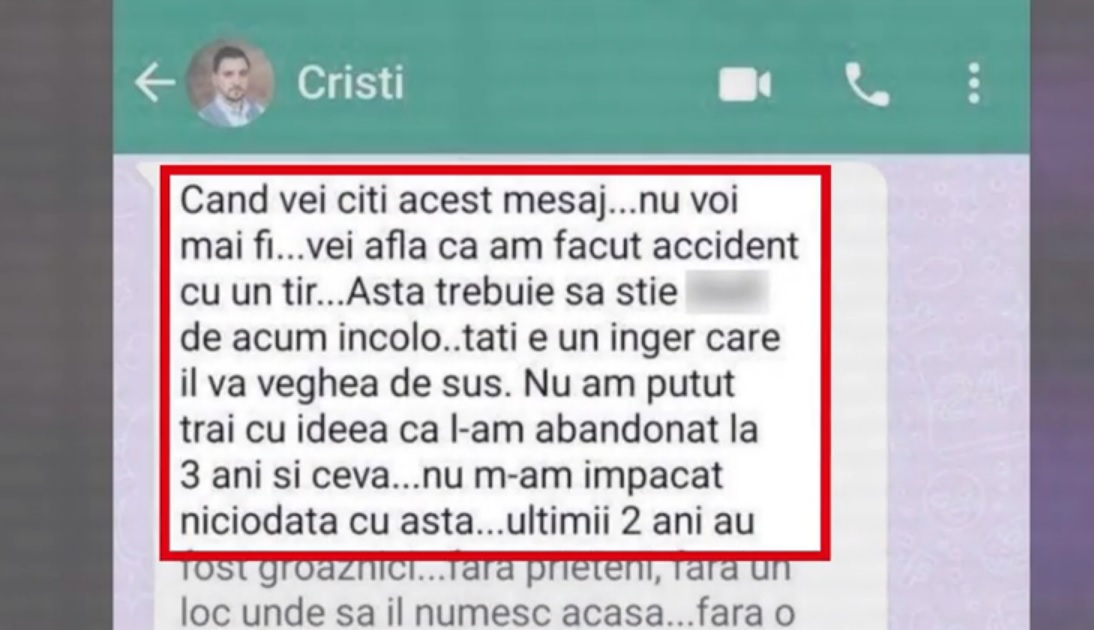 „Când vei citi acest mesaj…nu voi mai fi…vei afla că am făcut accident cu un TIR…Asta trebuie să ştie Ştefi de acum încolo…tati e un înger care îi va veghea de sus….Nu am putut trăi cu ideea că l-am abandonat la 3 ani şi ceva….nu m-am împăcat niciodată cu asta….ultimii 2 ani au fost groaznici ….fără prieteni, fără un loc unde să îl numesc acasă…fără o familie …da…Acea femeie m-a omorât cu adevărat …ţi-am lăsat toţi banii transferaţi în cont 300 milioane am transferat pentru Ştefi…să nu ştie nimeni….atât