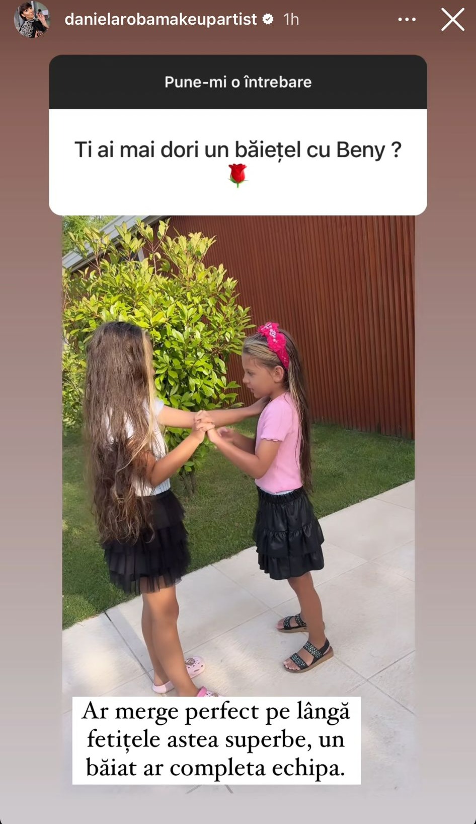 Recent, pe rețelele de socializare, ea a recunoscut că de data aceasta și-ar dori să fie mamă de băiat și să le facă un partener de joacă fiicelor ei.Întrebare: Ți-ai mai dori în băiețel cu Beni?