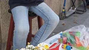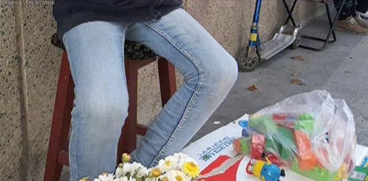 Imbracat intr-o buza de trenig si o pereche de blugi, baiatul si-a scos singurele jucarii in strada, la vanzare, pentru a nu ingheta de frig in aceasta iarna.