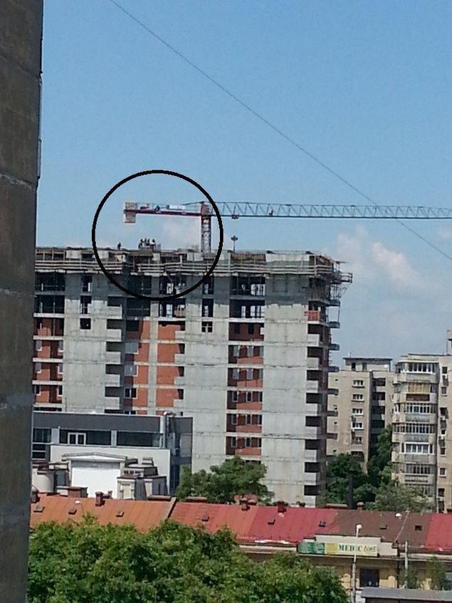 Barbatul se afla pe macara, iar negociatorii striga la el de pe terasa blocului (Foto: dcnews.ro) In Bucuresti au loc, de duminica dimineata, negocieri cu un barbat in varsta de 37 de ani care ameninta ca se arunca de pe o macara, in intersectia Calea 13 septembrie cu Sebastian. Negociatorii au urcat pe un bloc din apropiere, dar se afla la 10 metri sub nivelul cabinei macaralei, scrie dcnews.ro.