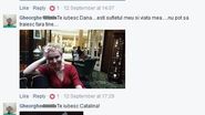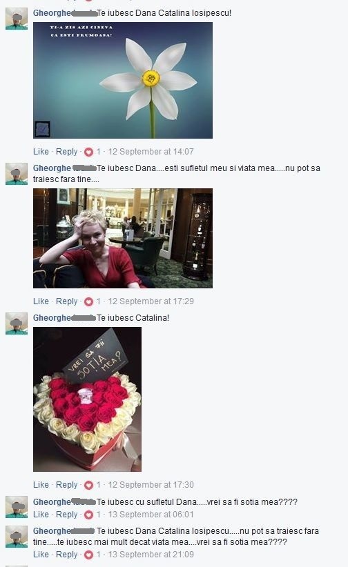 „Te iubesc Dana Catalina Iosipescu!!....inima mea....Te iubesc Dana!!....sufletul meu drag....Te iubesc Dana Catalina Iosipescu....mai mult decat viata mea!!!...Te iubesc Dana!....esti cea mai desteapta....Te iubesc Dana....esti sufletul meu si viata mea....nu pot sa traiesc fara tine....Te iubesc Dana Catalina Iosipescu!....nu pot sa traiesc fara tine....te iubesc mai mult decat viata mea....vrei sa fi sotia mea????...Esti o minune!......esti atat de frumoasa!!!”, sunt cateva din mesajele trimise Danei Grecu. Curios este ca, pana acum, Dana Grecu nu l-a raportat la Facebook pe autorul mesajelor, desi acesta ii scrie de cateva luni.