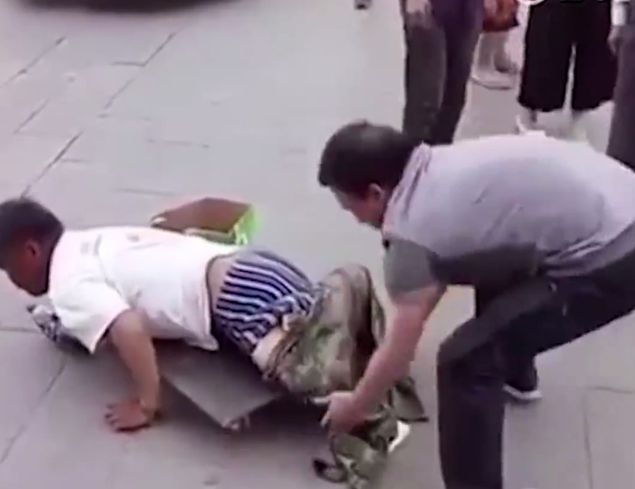 O filmare realizata pe teritoriul Asiei a devenit viral pe internet si a dezvaluit una din tacticile folosite de cei care cersesc pe strazi, pentru a atrage mila celorlalti.