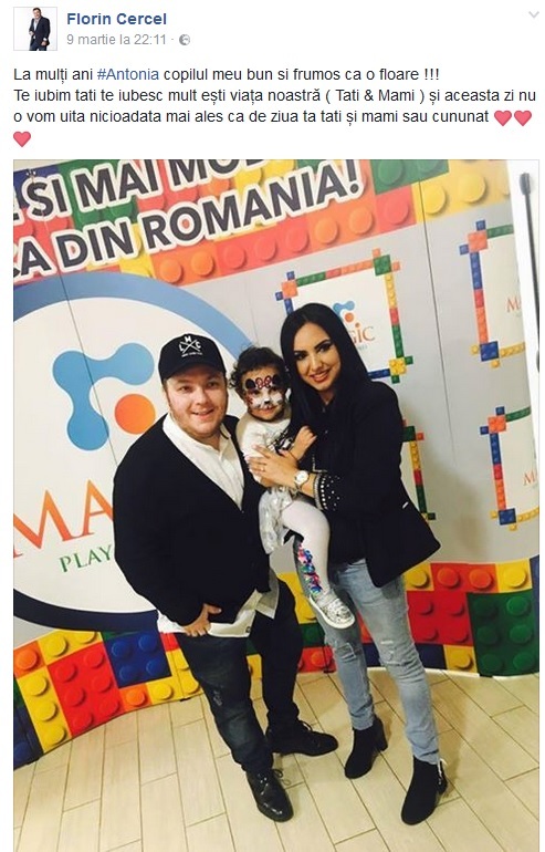 „La multi ani, Antonia, copilul meu bun si frumos ca o floare! Te iubim, tati, te iubim mult! Esti viata noastra si acesta zi nu o vom uita niciodata, mai ales ca de ziua ta tati si mami s-au cununat”, a scris Florin Cercel intr-o postare pe pagina lui de Facebook.