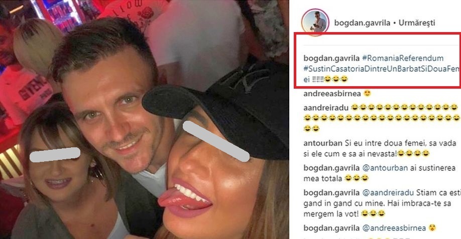 În week-end-ul în care s-a votat pentru familia tradiţională, un fost fotbalist al lui Dinamo îşi bate joc de referendum. ”Bogdan Gavrilă (26 de ani), fotbalist cu 48 de meciuri în tricoul "câinilor", în prezent la FC Valletta, în Malta, a postat pe Instagram o fotografie în care era flancat de două femei”, a dezvăluit gsp.ro.