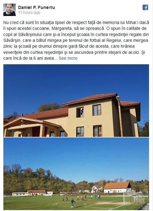 “Cucoană: nu aţi făcut nimic pentru Săvârşin în afară de a-i exploata frumuseţile, iar înainte să ai grija românilor, ai grijă de superbii platani din jurul reşedinţei de la Săvârşin, fă bine şi plăteşte cât de cât corect oamenii care lucrează pentru voi acolo… Îţi promit că odată doliul încheiat eu personal voi verifica că tot ce faceţi şi aţi făcut în Săvârşin este legal. În poze vedeţi aşa zisul cămin cultural din Săvârşin, care este la fix 20 de metri de reşedinţa regală şi terenul de fotbal, mai distrus ca acum 40 de ani”, a incheiat Daniel Funeriu.