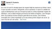 “Nu cred că sunt în situaţia lipsei de respect faţă de memoria lui Mihai I dacă îi spun acestei cucoane, Margareta, să se oprească. O spun în calitate de copil al Săvârşinului care şi-a început şcoala în curtea reşedinţei regale din Săvârşin, care a bătut mingea pe terenul de fotbal al Regelui, care mergea zilnic la şcoală pe drumul dinspre gară făcut de acesta, care hrănea veveriţele din curtea reşedinţei şi se ascundea printre stejarii de acolo. Şi care încă de la 6 ani avea pentru Rege un soi de pioşenie infantilă: aşa cum spuneau bătrânii din sat eu eram sigur că va reveni şi ne va face bine”, a scris Funeriu.