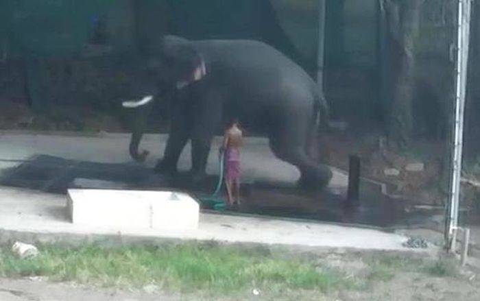 Accidentul s-a petrecut la un centru din sudul Indiei, în Kerala, potrivit Daily Mail. Îngrijitorul Arun Panikkar, în vârstă de 40 de ani, încerca să spele animalul. După ce l-a lovit cu o bâtă pentru a-l forța să se așeze, Panikkar a alunecat și a căzut în cel mai rău loc posibil la acel moment, chiar în timp ce elefantul executa comanda primită, lăsându-se pe o parte.