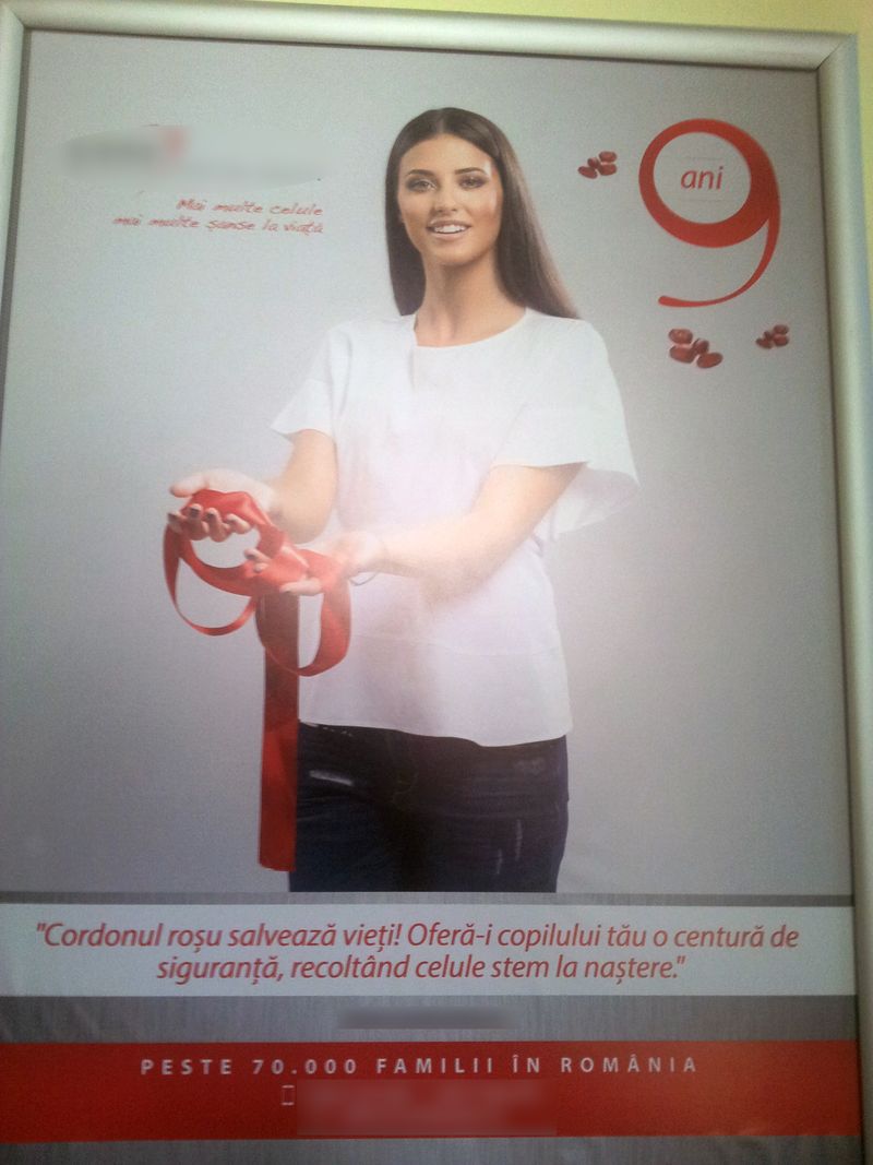 “Cordonul rosu salveaza vieti! Ofera-i copilului tau o centura de siguranta recoltand celule stem la nastere”, este indemnul protagonistei noastre, care apare scris pe afisul bancii de celule stem.