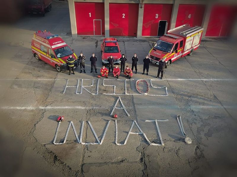 Pompierii din Detașamentul Răsăuți au creat o urare de Paște inedită. Cu ajutorul lumânărilor și a furtunurilor de apă ei au ”desenat” un mesaj pentru toți românii: Hristos a Înviat!