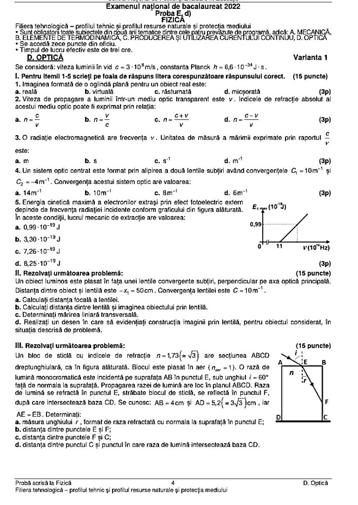 Subiecte BAC 2022. Proba la alegere: Fizică – profil tehnologic