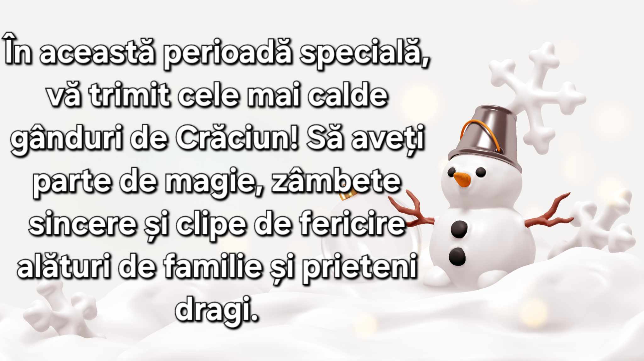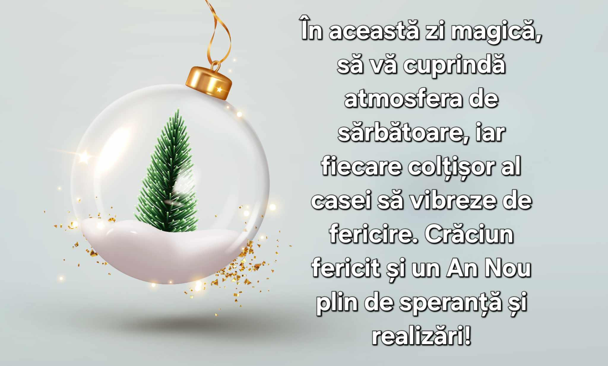 - Crăciun fericit! Fie ca lumina și căldura acestei sărbători să îți aducă bucurie, iar Anul Nou să vină cu noi oportunități și împliniri în toate aspectele vieții!