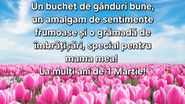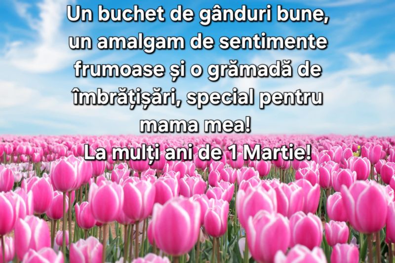Dragă mamă, cu ocazia zilei de 1 Martie îți trimit cele mai frumoase gânduri și îți mulțumesc pentru tot ce ai făcut pentru mine. Să fii sănătoasă și iubită mereu!