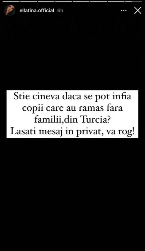 „Știe cineva dacă se pot înfia copii care au rămas fără familii în Turcia? Lăsați mesaj în privat, vă rog!”, a scris Ella în mediul online.