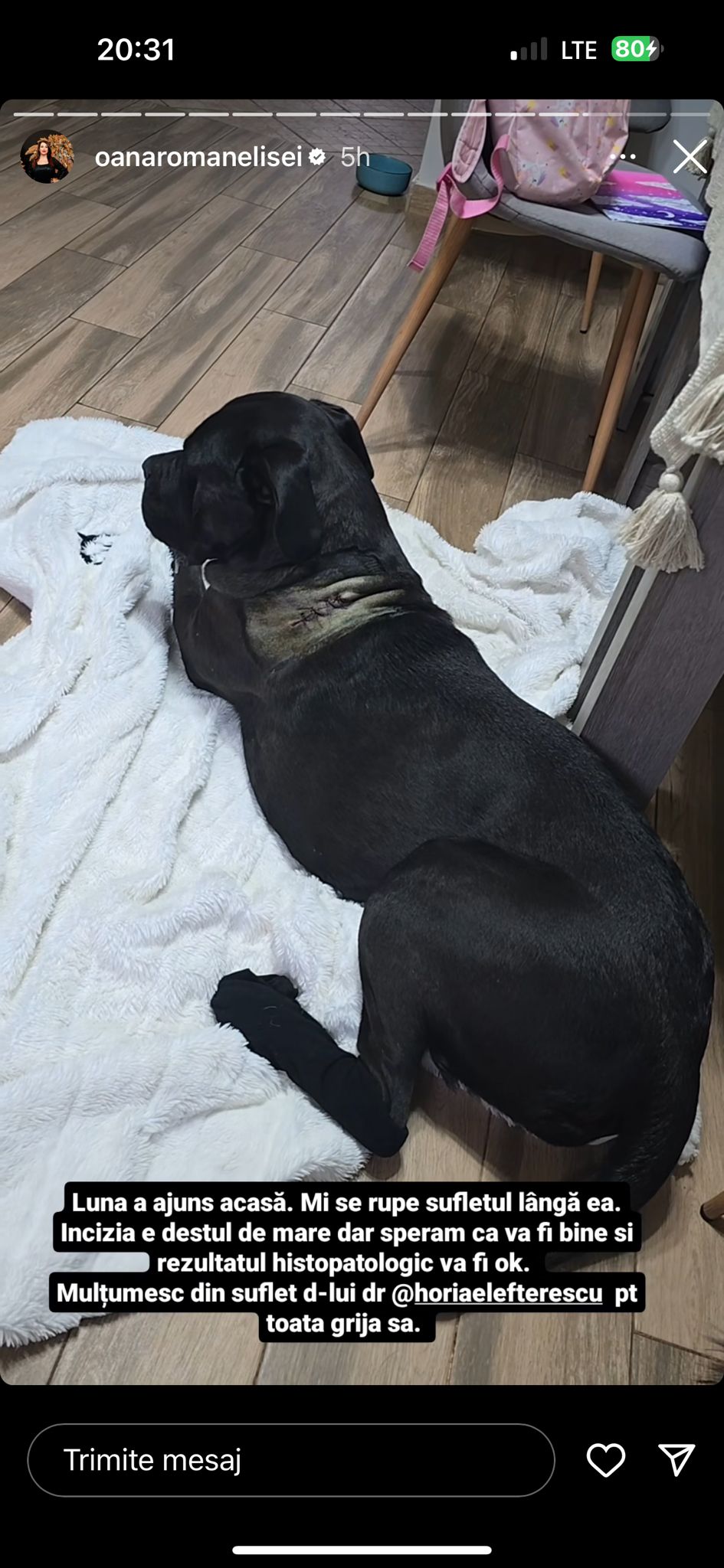 „Luna a ajuns acasă. Mi se rupe sufletul lângă ea. Incizia e destul de mare, dar sperăm că va fi bine și rezultatul histopatologic va fi ok.”, a mai scris Oana Roman, în dreptul unei imagini cu animalul ei de companie.