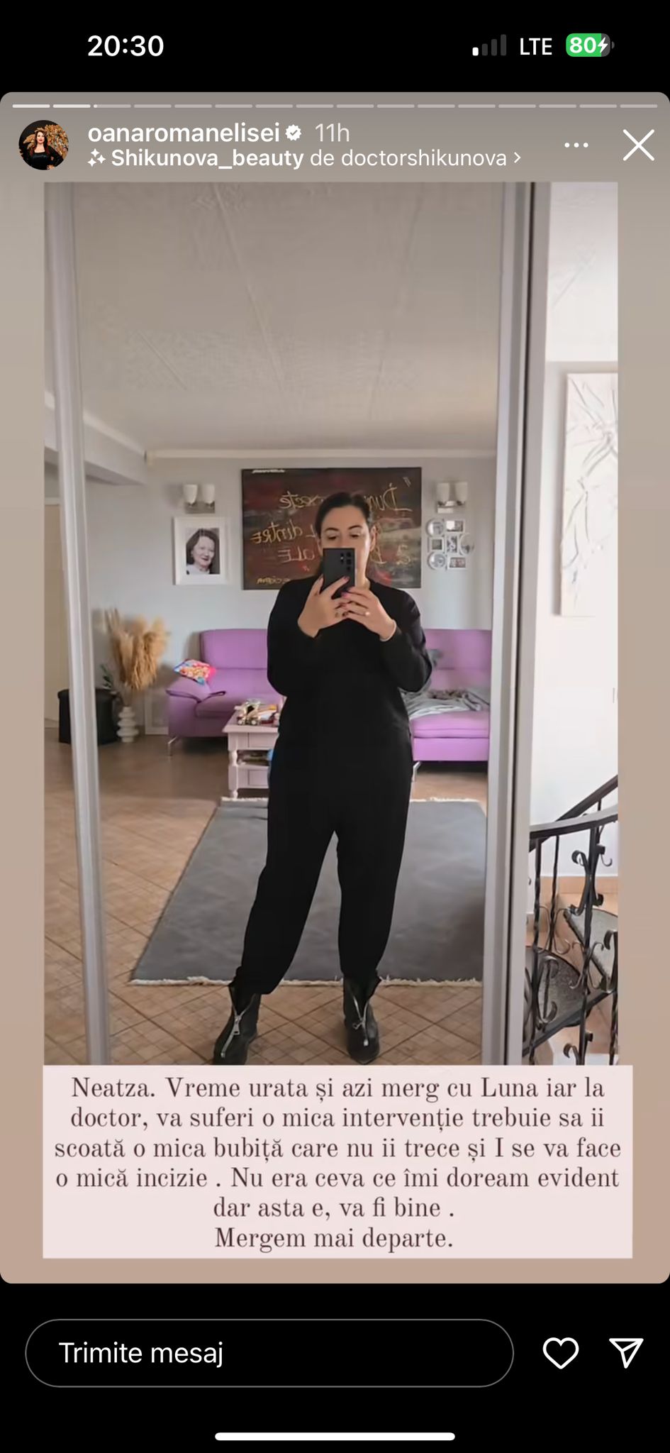 „Azi merg cu Luna iar la doctor, va suferi o mică intervenție. Trebuie să îi scoată o mică bubiță care nu îi trece și i se va face o mică incizie. Nu era ceva ce îmi doream, evident, dar asta e, va fi bine. Mergem mai departe.”, a fost mesajul transmis de Oana Roman, pe Instagram.