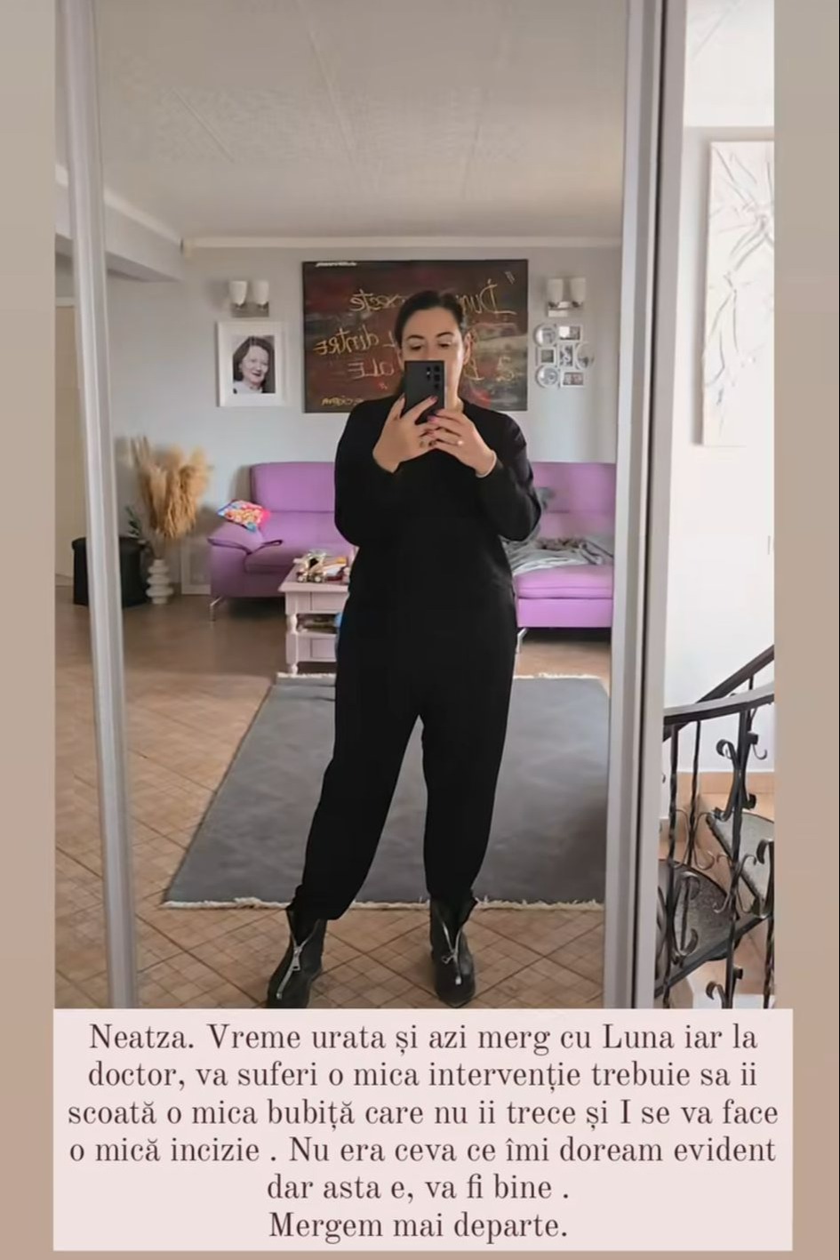 „Azi merg cu Luna iar la doctor, va suferi o mică intervenție. Trebuie să îi scoată o mică bubiță care nu îi trece și i se va face o mică incizie. Nu era ceva ce îmi doream, evident, dar asta e, va fi bine. Mergem mai departe.”, a fost mesajul transmis de Oana Roman, pe Instagram.