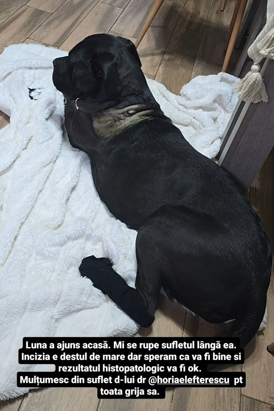 „Luna a ajuns acasă. Mi se rupe sufletul lângă ea. Incizia e destul de mare, dar sperăm că va fi bine și rezultatul histopatologic va fi ok.”, a mai scris Oana Roman, în dreptul unei imagini cu animalul ei de companie.