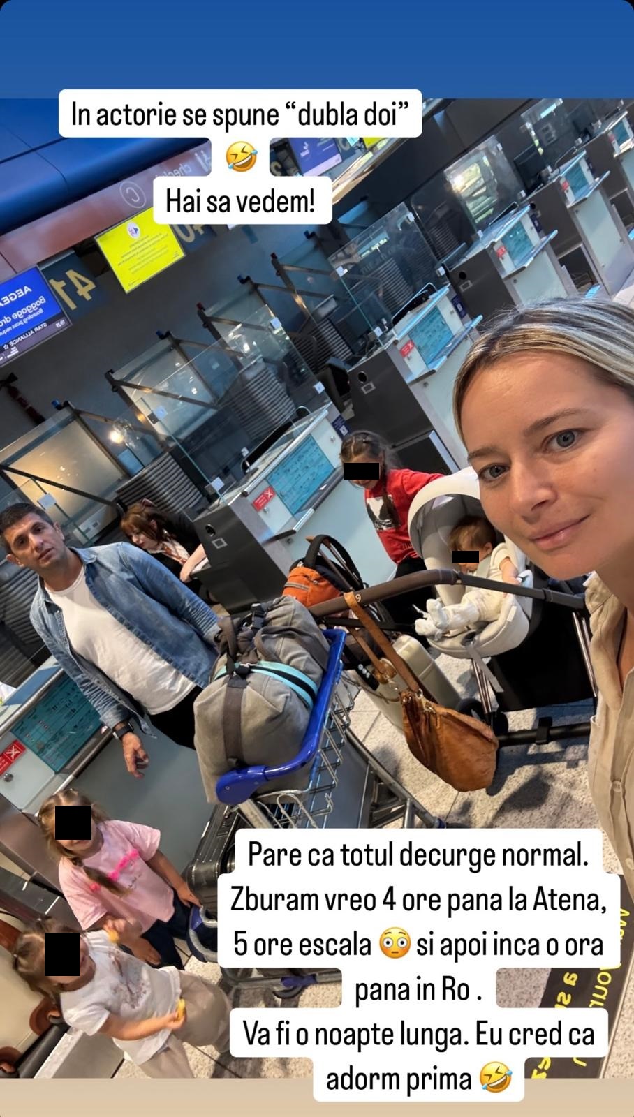 In seara asta ne pregătim să decolăm spre România, cu o escală lungă de 5 ore. Să ne țineți pumnii să fie totul bine”, a mărturisit Laura Cosoi în mediul online.