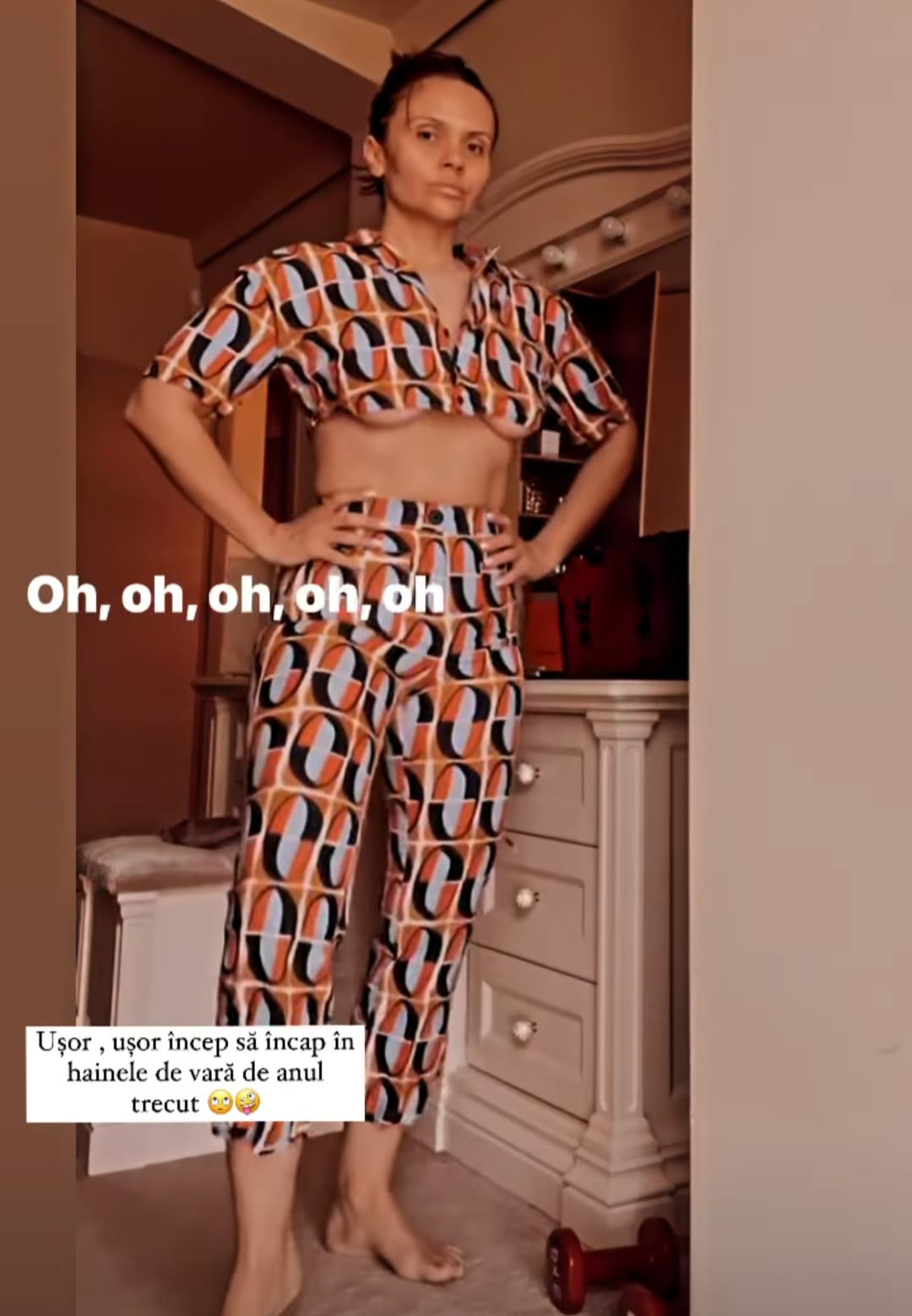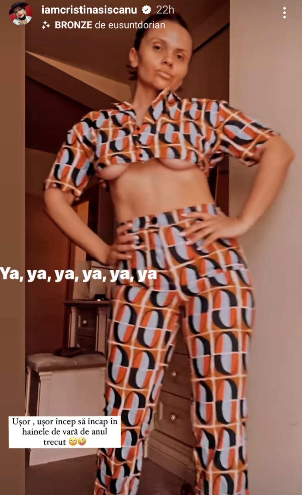 Soția lui Mădălin Ionescu s-a afișat îmbrăcată într-un compleu provocator, destul de decoltat, și a vrut să le arate fanilor cât de mult a slăbit în ultima perioadă: „Ușor, ușor încep să intru în hainele de vară de anul trecut. Colăceii s-au micșorat vizibil, dar mai sunt.”, a scris Cristina Șișcanu, în dreptul imaginilor care au stârnit criticile fanilor.