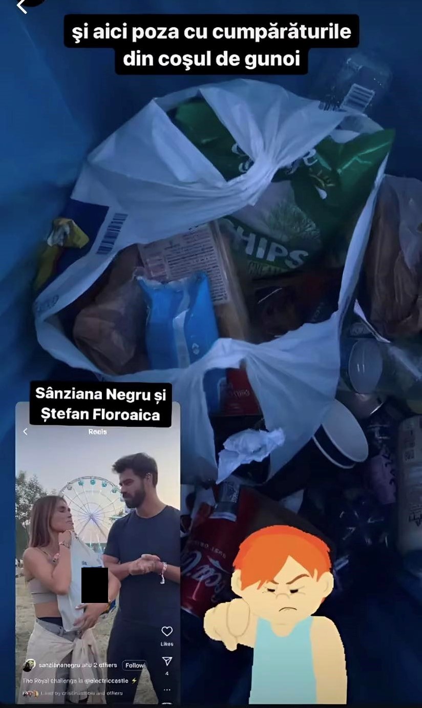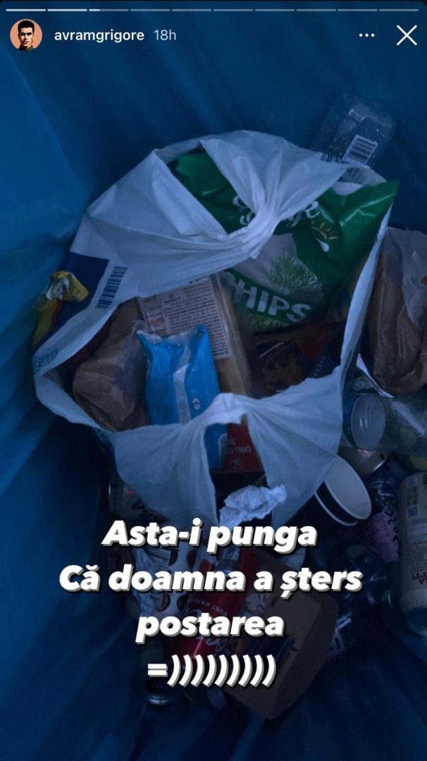 Toată punga, cu toate produsele, la gunoi. M-am dus cu prietenii mei la gunoi și ne-am uitat și erau produse din magazinul respectiv pe care ei le-au filmat, aruncate la gunoi. Eu înțeleg că n-ai unde să le pui, dar ieșeai afară în față la festival și dădeai punga aia unei doamne care vindea porumb. Și n-ai cum ca tu, după aceea, să apari pe Instagramul tău și să promovezi: „Vai, ce bune suntem noi, să facem fapte bune!”, și tu efectiv arunci o sacoșă plină de mâncare la gunoi. Pe mine m-a șocat, așa ceva nu există”, a explicat Avram Grigore pe pagina sa de TikTok, acolo unde a postat și o fotografie cu plasa celor doi.