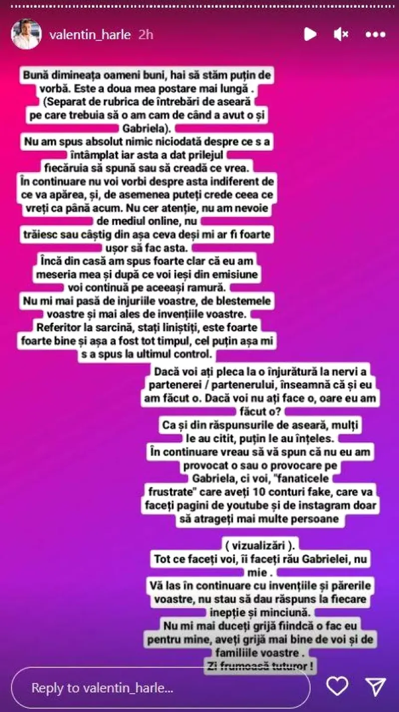 În continuare vreau să vă spun că nu eu am provocat-o pe Gabriela, ci voi, ‘fanaticele frustrate’ care aveți 10 conturi fake, care vă faceți pagini de Youtube și de Instagram doar să atrageți mai multe persoane (vizualizări)” , a fost mesajul lui Valentin, mai notează sursa citată.