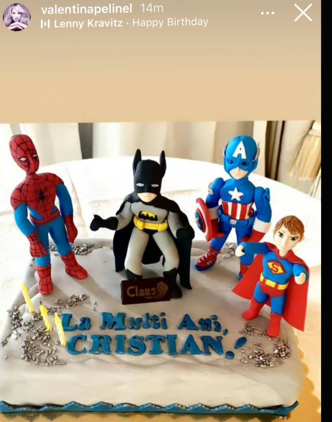 Afaceristul a avut parte și de o surpriză dulce. Soția lui a comandat un tort deosebit, pe care l-a ales chiar fiul lor, Milan. În fotografiile postate pe rețelele sociale, se poate observa că desertul este decorat cu figurine din desenele animate. „Milan și-a dorit pentru tati un tort cu eroi!”, a scris Valentina pe Instagram.